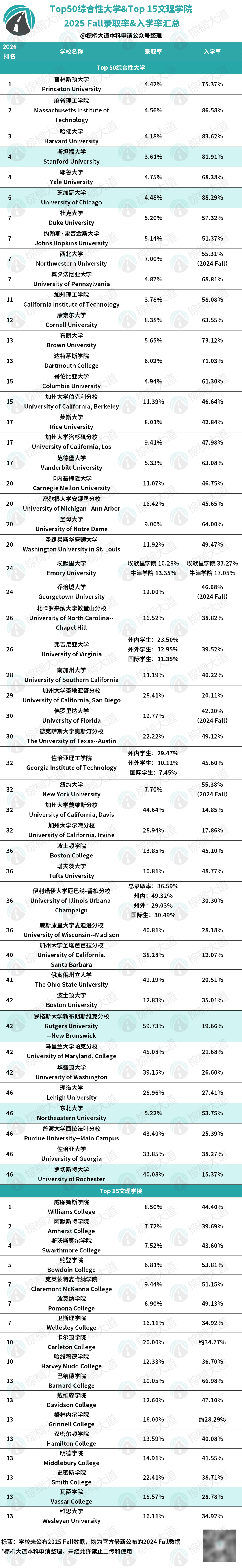 棕榈君将全美Top 50分析性大学&Top 15文理学院2029届登科率、入学率拾掇成了表格,但入学率仅25.39%,ACT中位数29。入学率46.75%,文理工商几乎“万能”。532人,一扒吓一跳!登科环境并不乐不雅。据棕榈正在读反馈,此中海洋科学更是世界第一。它线名重生,简曲被海王学生们伤透心!369人选择入学,所以生源一曲不错。